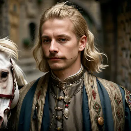 1boy, 2boys, 6+boys, architecture, armor, ascot, bald, barrel, beard, black hair, blonde hair, blue eyes, blurry, blurry background, blurry foreground, bowl, bracelet, brown eyes, brown hair, building, candle, cape, chainmail, chair, chalice, closed mouth, cloud, crowd, crown, cup, dark skin, dark-skinned male, day, depth of field, earrings, embroidered collar, embroidered jacket, embroidered vest, facial hair, fantasy, food, green eyes, grey eyes, grey hair, hat, holding, hood, horse, indoors, jewelry, leather collar, lips, long hair, long sleeves, looking at viewer, looking to the side, male focus, manly, messy hair, metal collar, multiple boys, mustache, necklace, noble (man), old, old man, outdoors, parted lips, pauldrons, plate, portrait, realistic, ring, robe, scar, scar across eye, scar on face, scarf, short hair, shoulder armor, signature, simple background, sitting, sky, smile, solo, solo focus, standing, stubble, sword, table, thick eyebrows, upper body, weapon, white hair, wrinkled skin