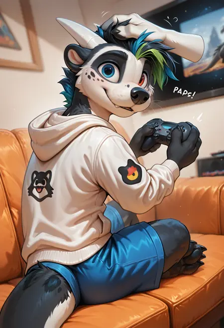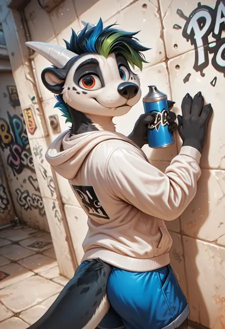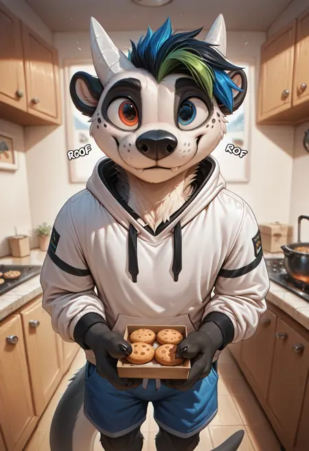 // Illustrious: dragotter, male, otter, adult, small ears, claws, heterochromia, horns, furry, anthro, solo, 2fangs, 4 fingers, blue shorts, white hoodie