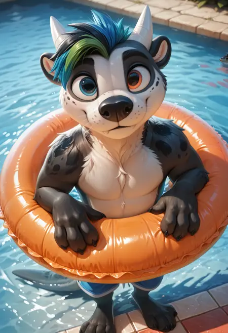 // Pony: dragotter, solo, body fur, multicolored hair, black and white body, furry, horns, blue hair, green hair, furry male, two-tone hair, black hair, animal ears, brown and blue eyes, fangs, animal nose, freckles, spots,