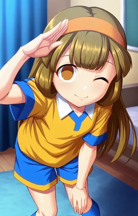 kinako, brown hair, orange headband, brown eyes, yellow shirt, short sleeves, blue shorts