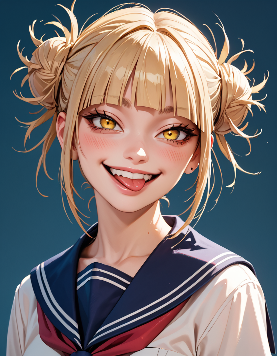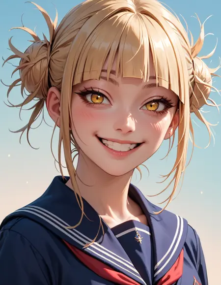 t0g4p, Cowboy Shot, 1girl, solo, double bun, blonde hair, yellow eyes, school uniform,