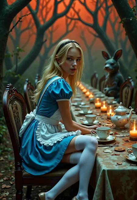 AliceInUnderland LoRA를 사용하면 창작자들이 루이스 캐럴의 영원한 세계를 고딕적인 매력과 초현실적인 활력으로 재해석할 수 있습니다. 이 LoRA는 당신의 작품을 월랜드의 상징적 캐릭터들이 담은 어두우면서도 아름다운 이미지로 변환하여, 비현실적인 것을 현실로 만듭니다.