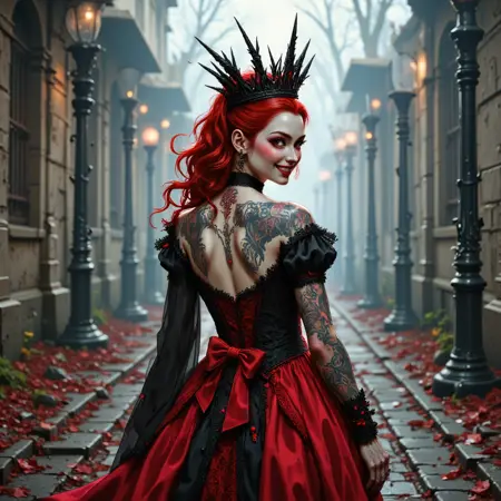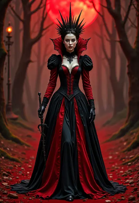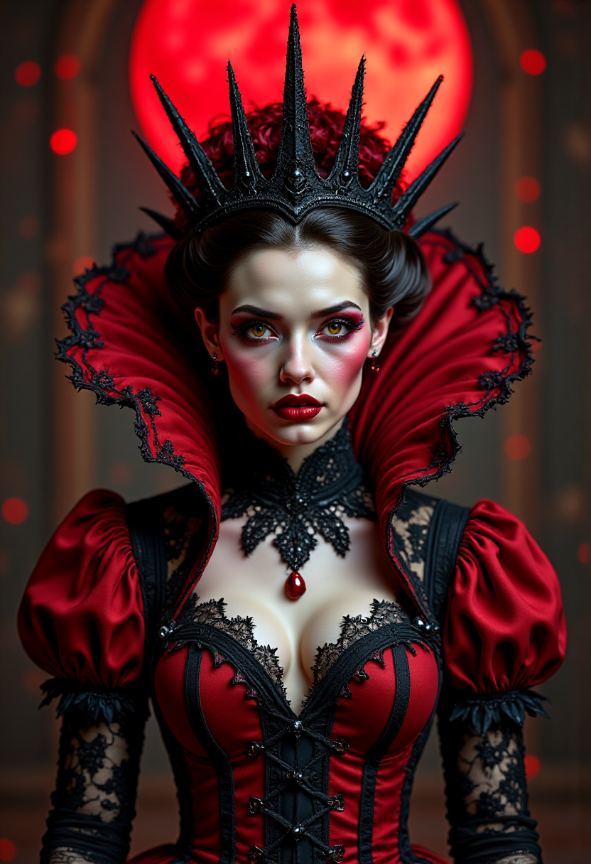 Red Queen, 창백한 도자기 같은 얼굴, 검정과 자홍색 머리카락, 깊은 피처럼 붉은 입술, 검은 왕관의 날카롭고 갈라진 뾰족한 봉우리, 자홍색과 검정색 고딕 스타일의 드레스.