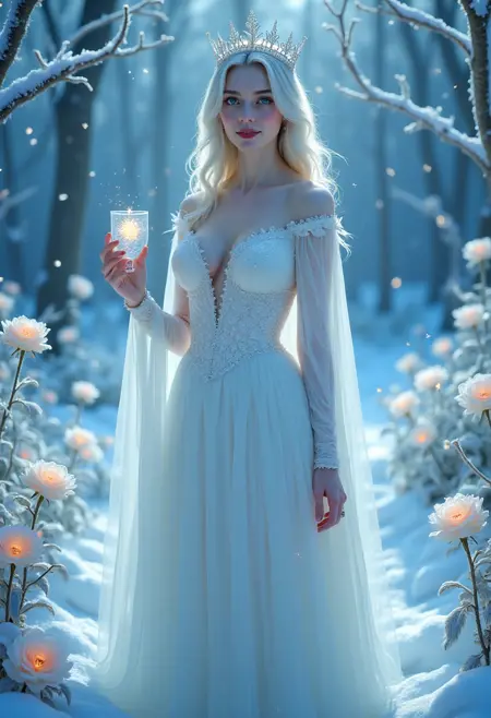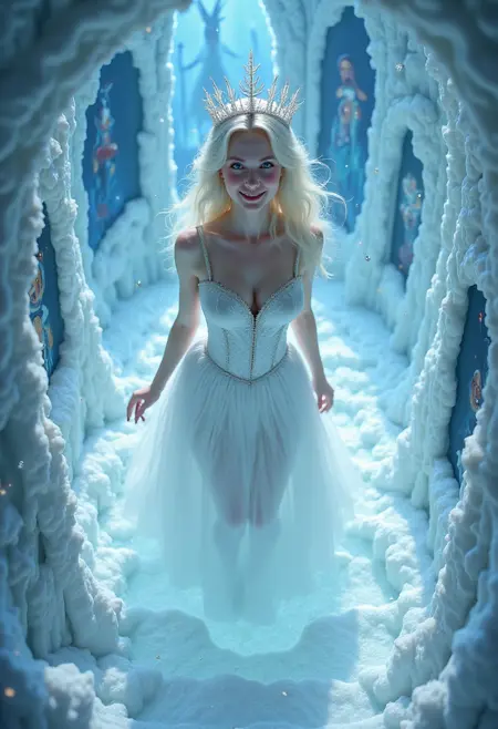 White Queen, 반짝이는 흰색 실크 드레스, 창백한 피부, 날카로운 푸른 눈, 은색 금발, 약간의 미쳤음을 품은 모습.