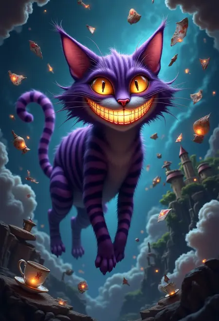 Cheshire Cat, 빛나는 미소, 화려한 보라색, 그림자 같은 줄무늬, 황금색 눈.