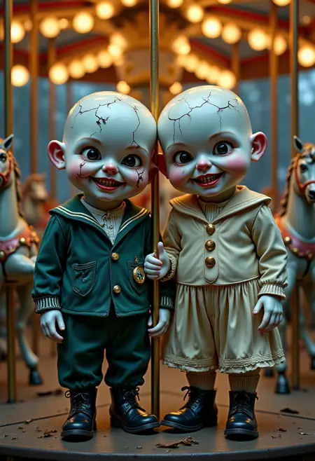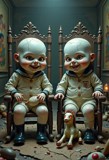 Tweedle Twins, 볼록한 어린아이 같은 체형, 두꺼운 갈라진 흰색 메이크업, 둥근 도자기 같은 얼굴, 과도하게 큰 머리.
