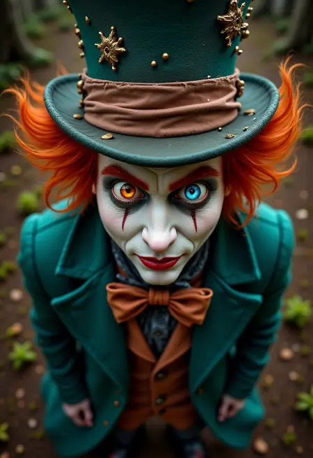 Mad Hatter, 어긋난 눈, 하나는 황갈색, 하나는 푸른색인 과도하게 큰 눈, 불길한 주황색 머리카락, 과도하게 큰 모자, 잘 맞춘 코트.
