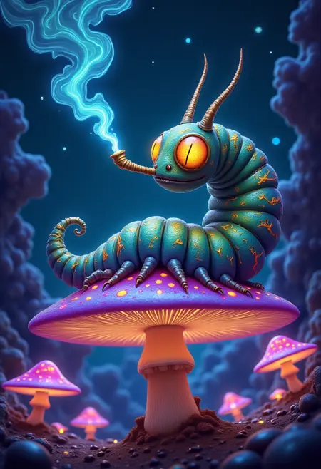 Caterpillar, 세로로 나뉜 다채로운 몸, 전기색 파랑, 밝은 녹색, 진한 보라색, 큰 볼록한 눈, 황금색 눈, 환각적이고 초월적인 모습.