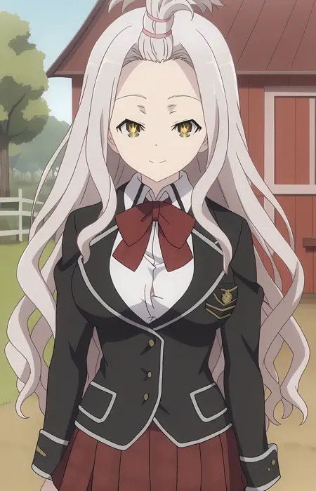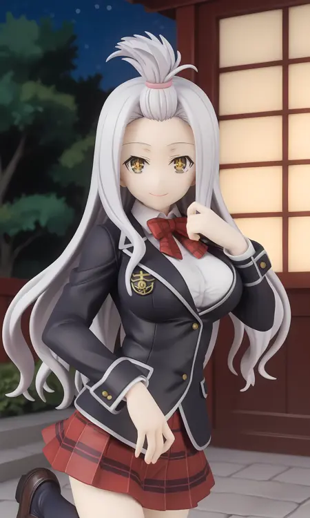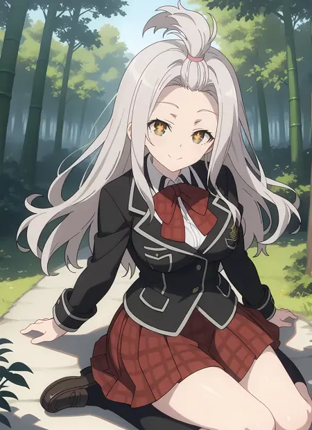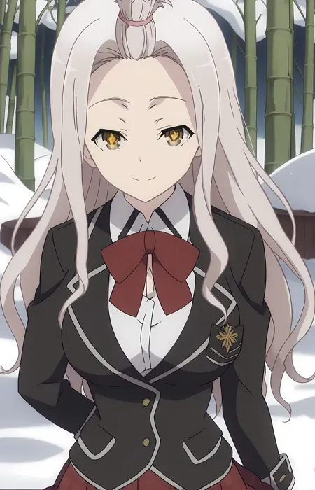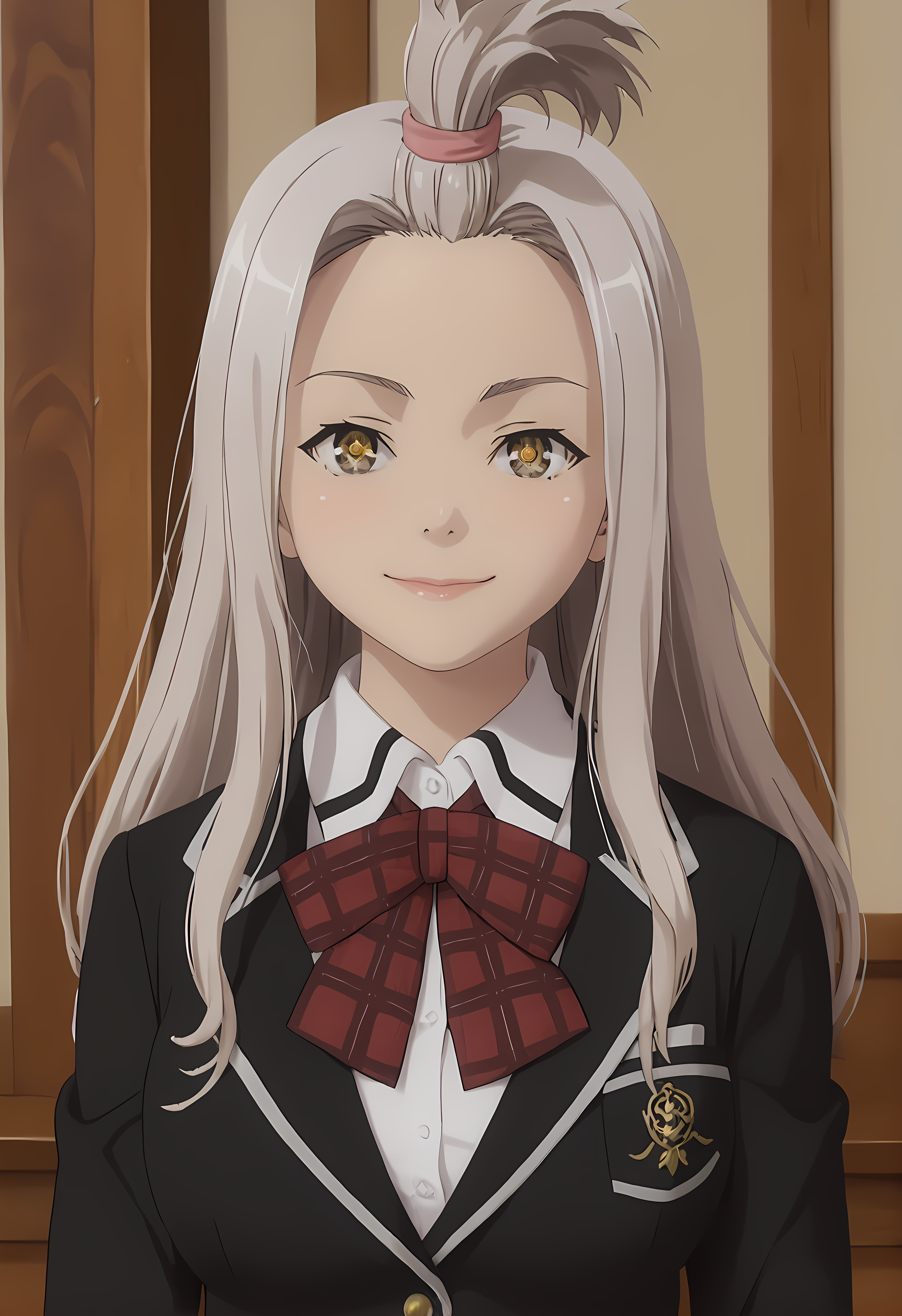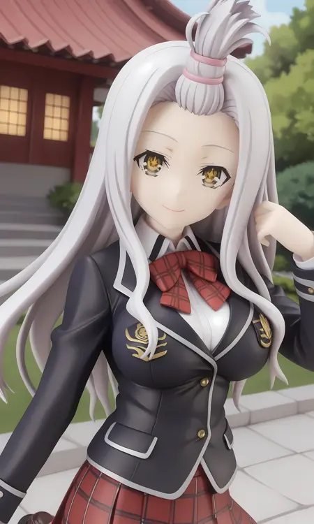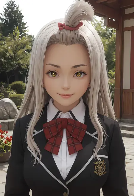 Appearance → ohwx, long_hair, grey_hair, yellow_eyes, white_hair, brown_eyes, forehead, bangs_pinned_back, topknot, breasts, very_long_hair, large_breasts, symbol-shaped_pupils,
