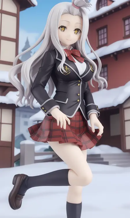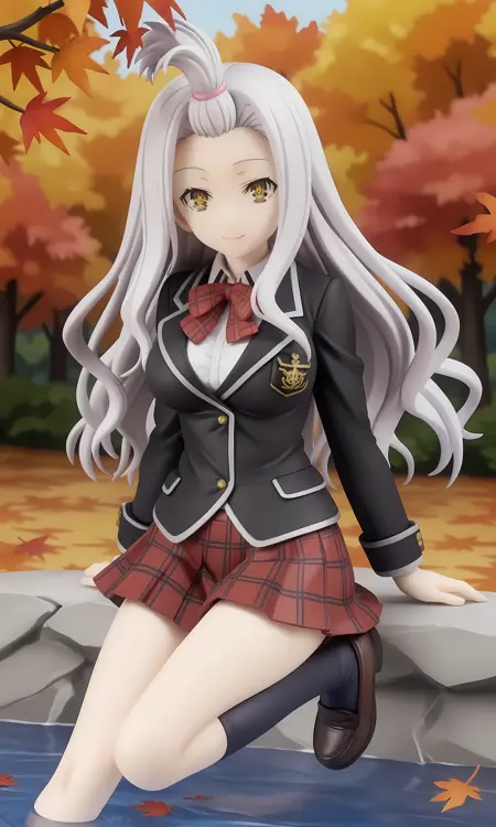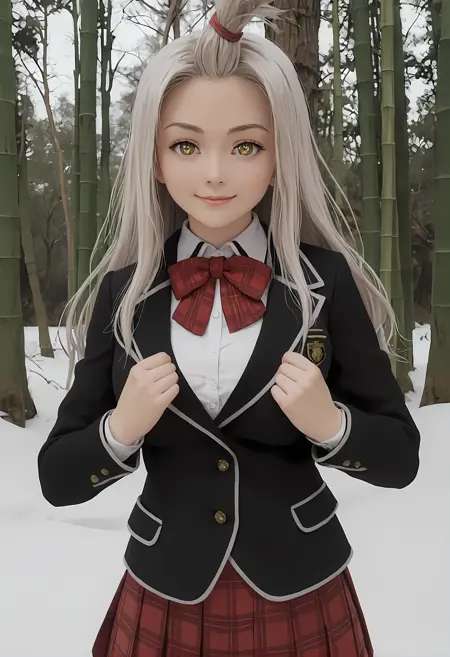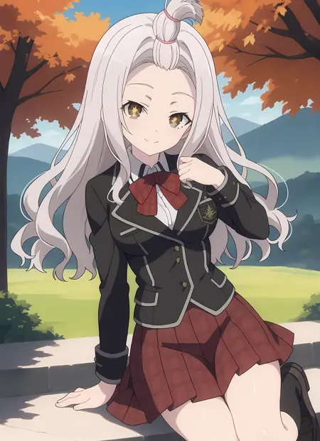 Outfit → school_uniform, bow, jacket, blazer, bowtie, shirt, plaid, skirt, socks, red_bow, bangs_pinned_back, topknot, plaid_skirt, long_sleeves, red_skirt, red_bowtie, black_socks, pleated_skirt, kneehighs, black_jacket, collared_shirt, shoes, loafers, official_style, white_shirt, plaid_bow, ribbon, miniskirt,
