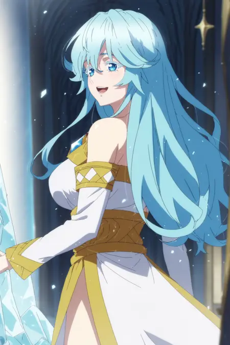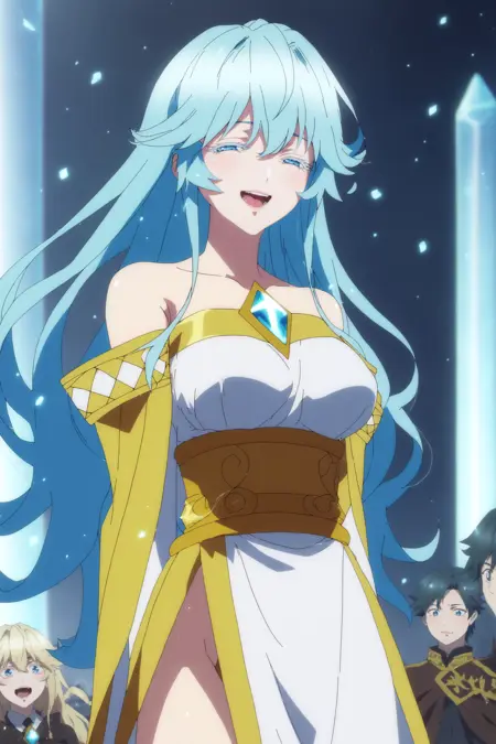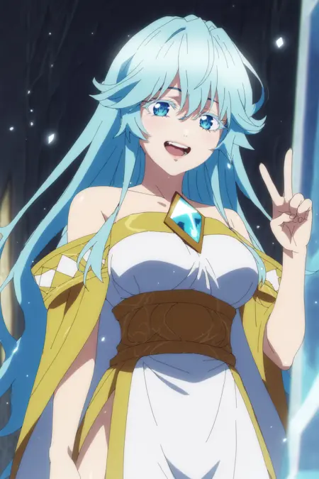 トリガー: elfaria albis serfort,1girl,solo,mature_female,long_hair, bare_shoulders,smile,hair_between_eyes, bangs, eyelashes, collarbone, breasts, very_long_hair, colored_eyelashes