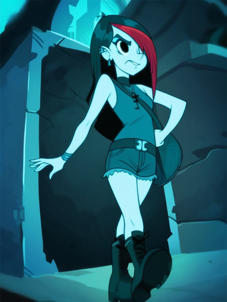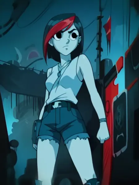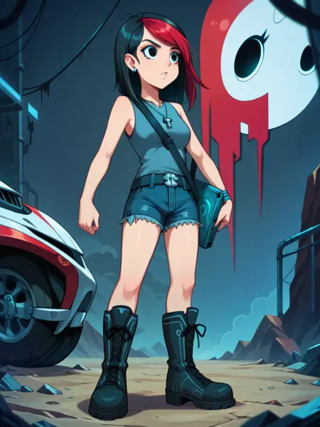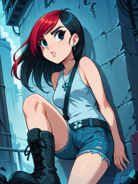 典型服饰标签:无袖上衣、牛仔短裤、靴子、腰带、项链
