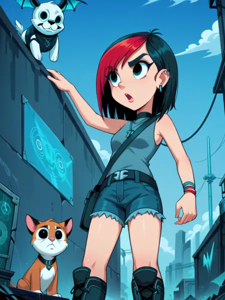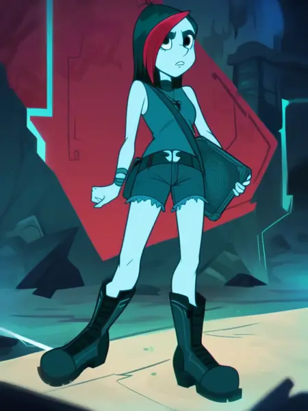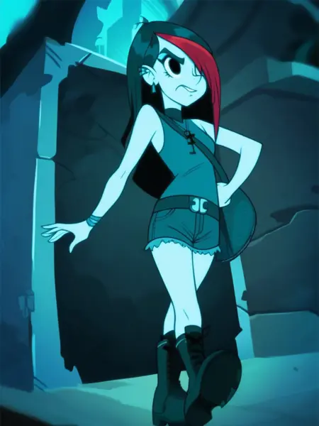 Typical outfit tags: sleeveless shirt, denim shorts, boots, belt, necklace