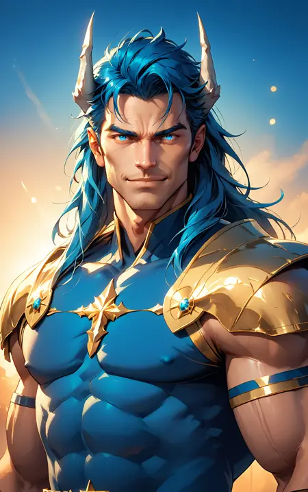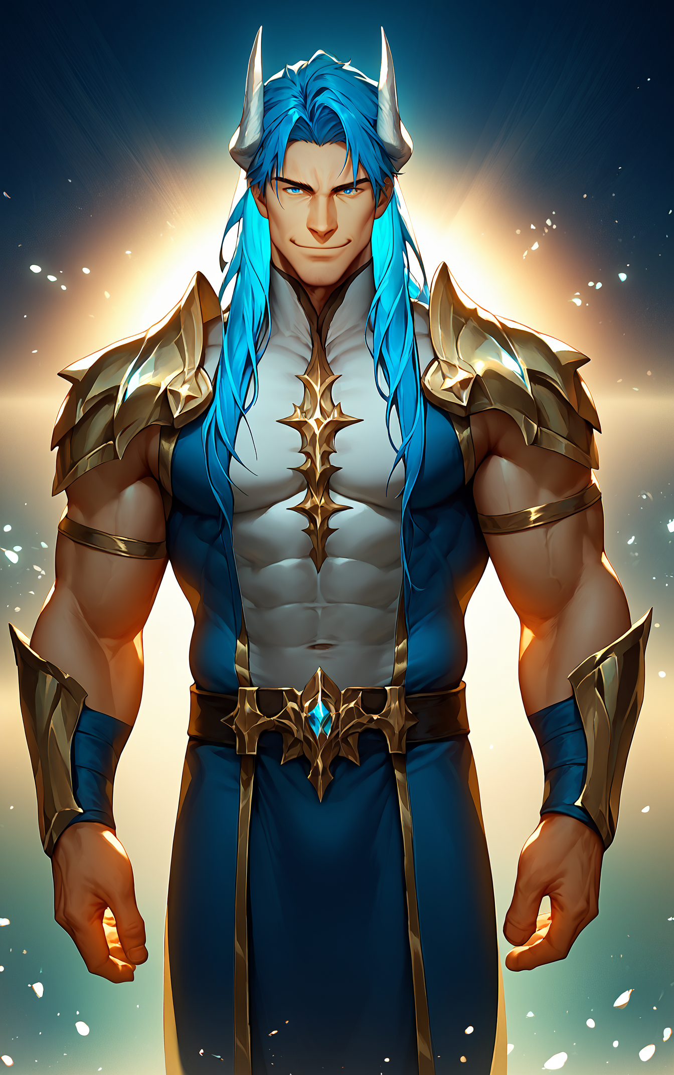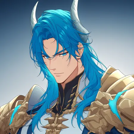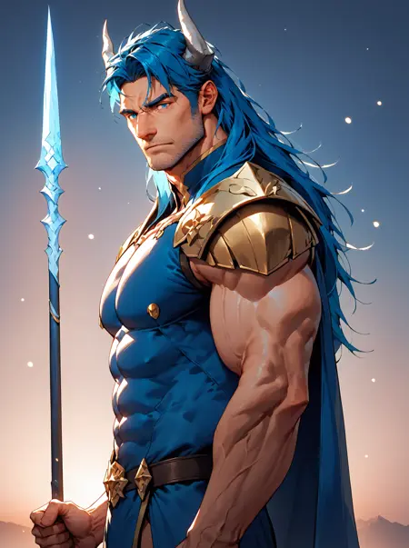 タグ: Mort, 長い髪, 青い髪, 黄金の肩甲胄, 白と青のローブ, 青い目, 角, 黄金の手甲, 矛槍,