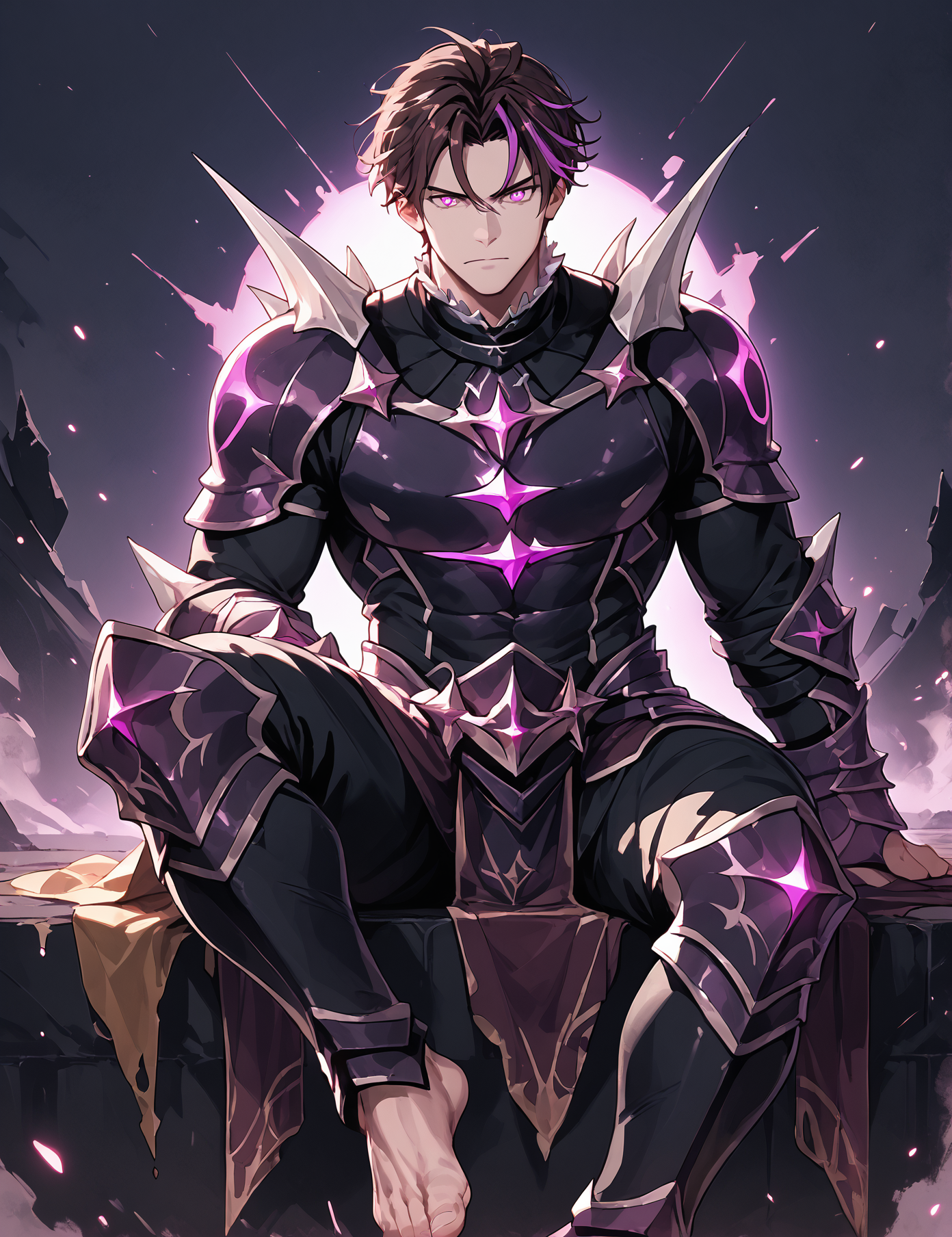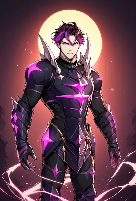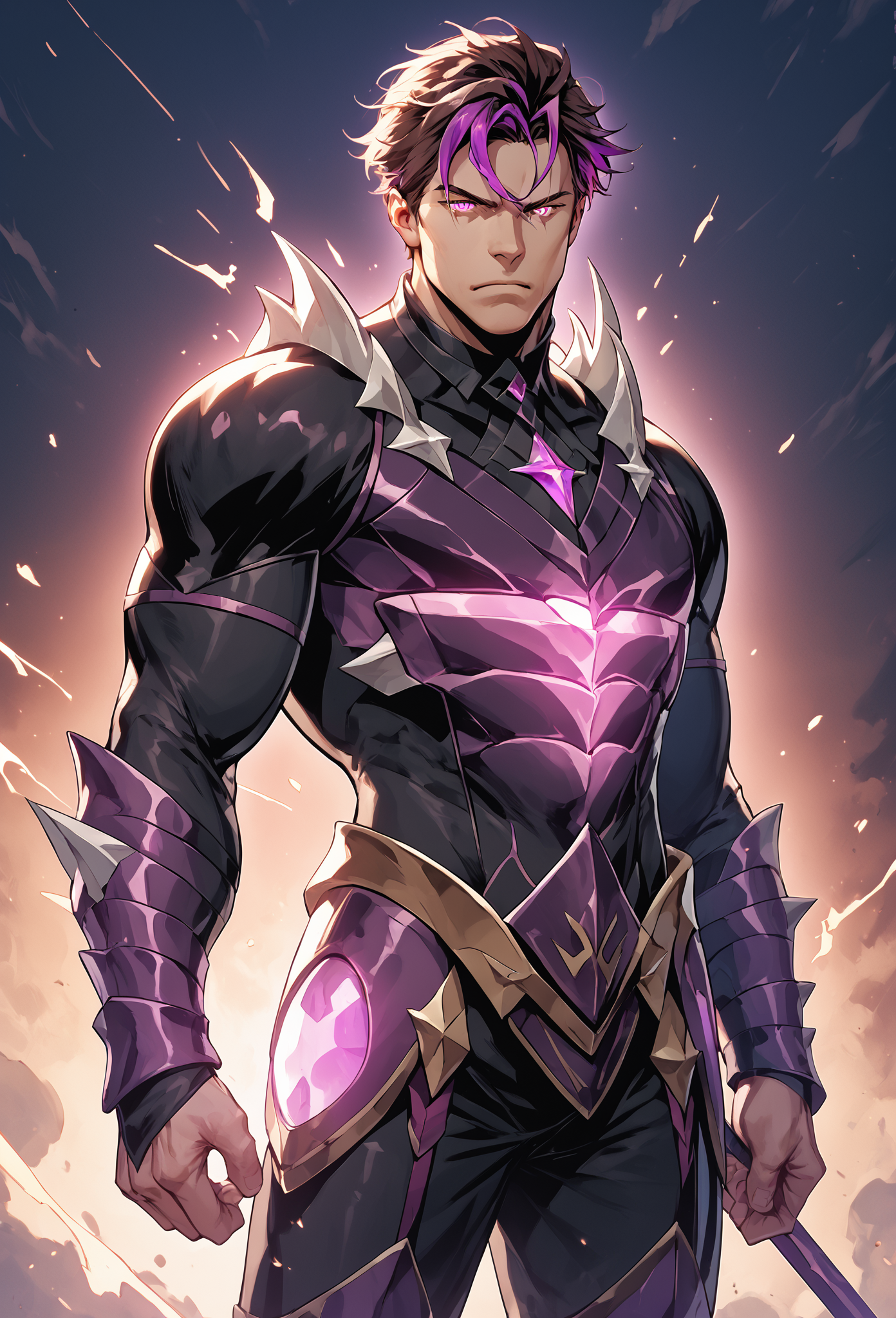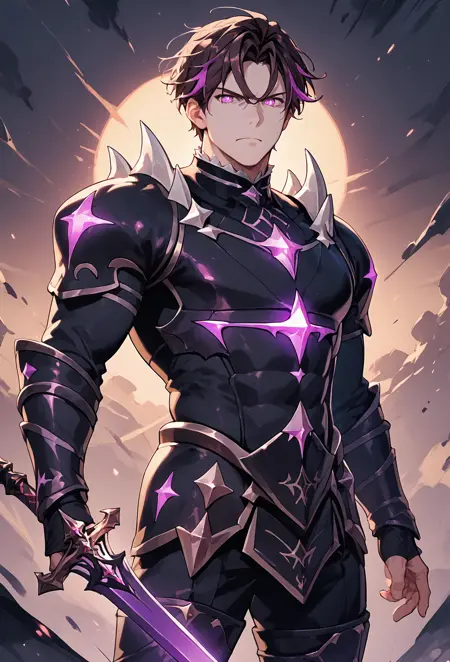 트리거 단어: 1boy, solo, Kayron, 날카로운 어깨, 검은 갑옷, 빛나는 보라색 갑옷 문양, 짧은 갈색 머리, 보라색 눈, 창백한 피부