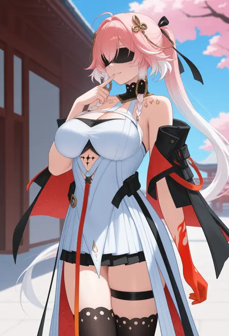 Trigger + Appearance: ch4ngli, tacet mark, body markings, long hair, multicolored hair, pink hair, white hair, hair between eyes, ahoge, braid, ponytail, hair ornament, yellow eyes, large breasts