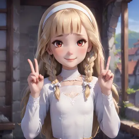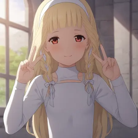 blonde hair, long hair, side braids, red eyes