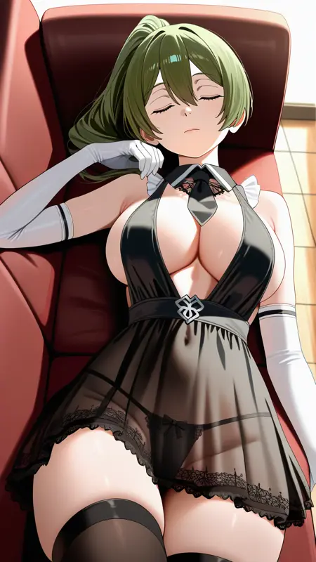 nc2b-dress, black dress, detached sleeves, detacher collar, black necktie, black leotard, maid, elbow gloves, white gloves, black thighhighs, plunging neckline, backless dress, frills, panties, see-through skirt,