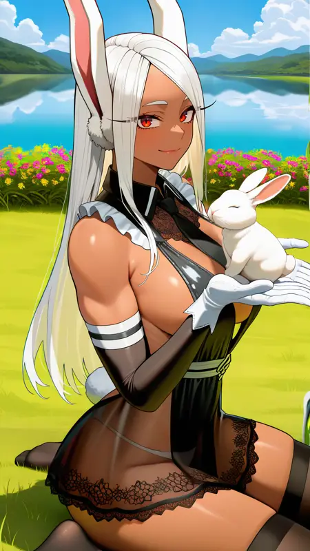 holiday rabbit, grey leotard, zipper, sleeveless leotard, rabbit tail, cleavage, hood down, rabbit hood,