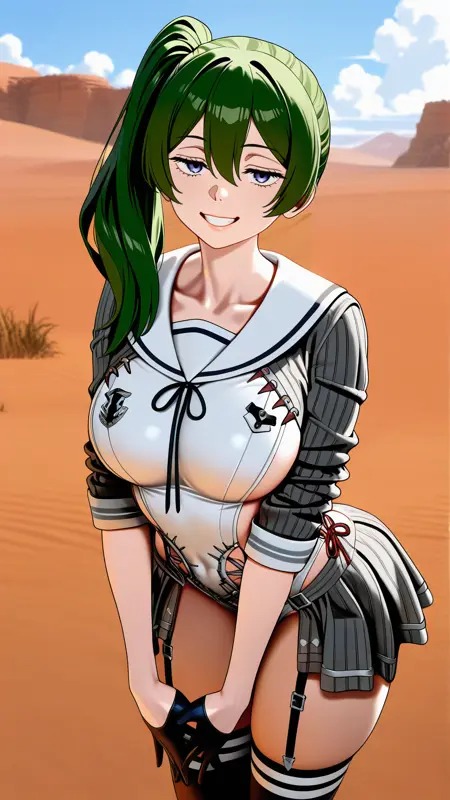 war-dress, school uniform, white leotard, side cutout, black thighhighs, sailor collar, striped sleeves, sleeves rolled up, thigh straps, black ribbon, black ribbon, white panties, garter straps, black gloves, half gloves, skirt, mechanical parts, collarbone,