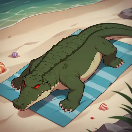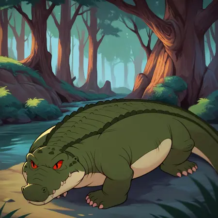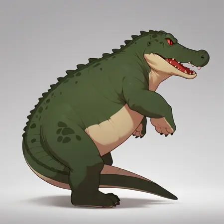 Dillbt, feral, female, Deinosuchus, crocodilian, green skin, red eyes,