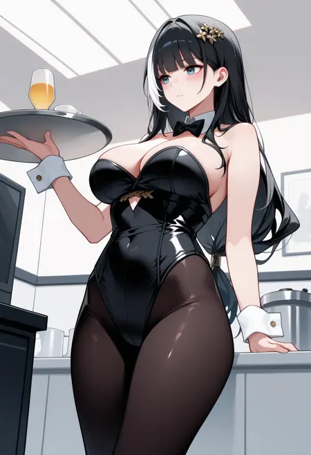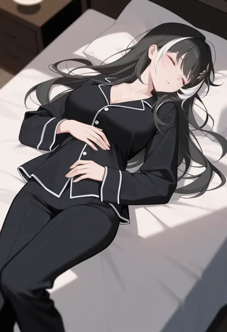 Trigger + Appearance: ba1zhi, leg tattoo, long hair, streaked hair, black hair, white hair, hair ornament, blue eyes