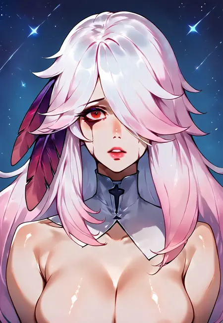 RED EYES, HAIR OVER ONE EYE,