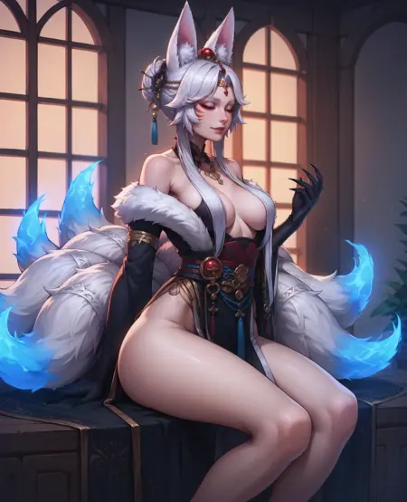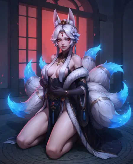 트리거: YumekoRSL, 1girl, 동물 귀, 흰 머리카락, 머리 장식, 보석, 여우 귀, 여우 꼬리, 여러 꼬리, kitsune, 여우 소녀