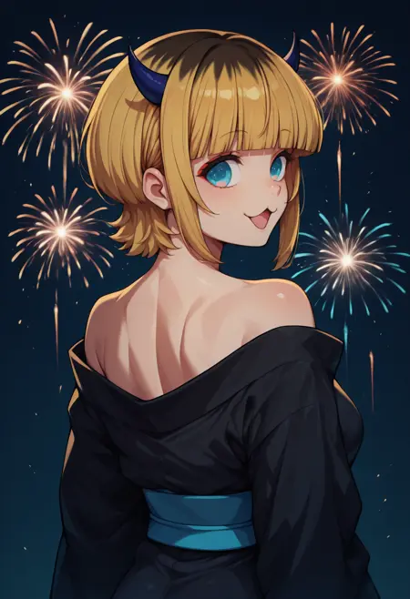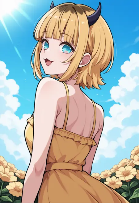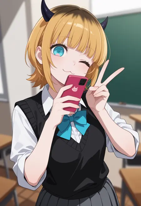 触发词 + 外貌: m3mcho, 短发, 多色发, 金发, 齐刘海, 侧发, 假角, 魔鬼角, 蓝眼睛