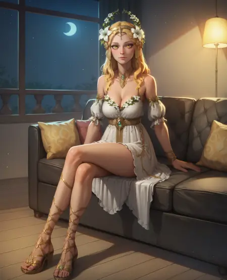 衣装: 白いドレス, 胸元の露出, 肩の露出, ジュエリー, サンダル