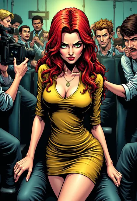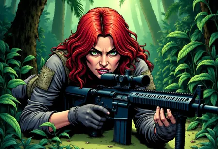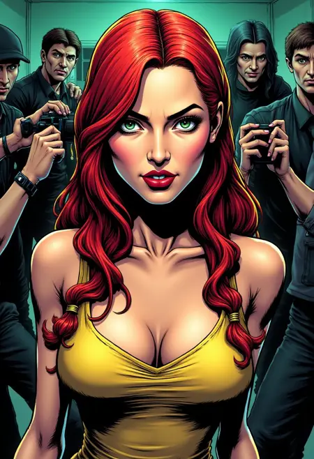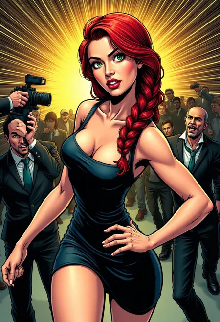 「Kara、炎のように赤い髪、緑の目、(設定)、コミックブックのアートスタイル、コミック、ダイナミックなライン、鮮やかな色、表現力豊かなキャラクター、アクション満載の構図、エネルギーと興奮を加える」