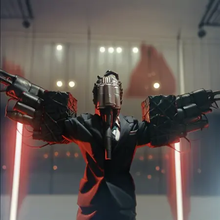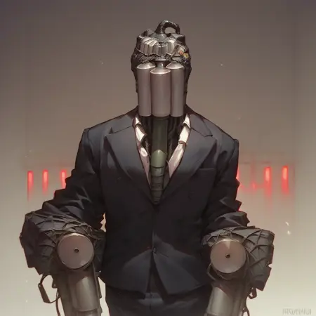 Flamethrower devil, flamethrower arms, arm cannon, fuel tank head, suit, necktie, formal