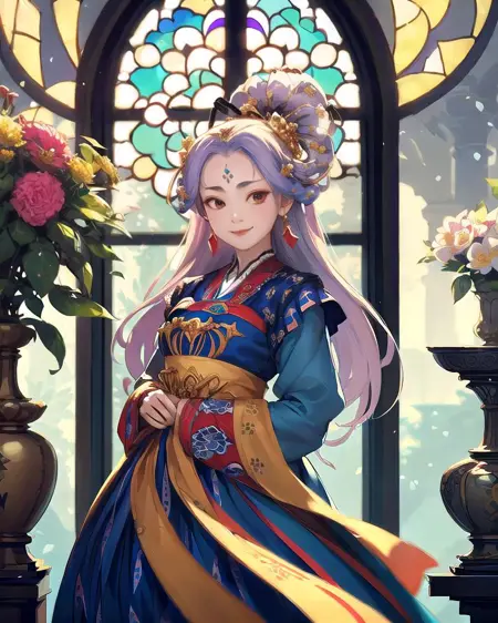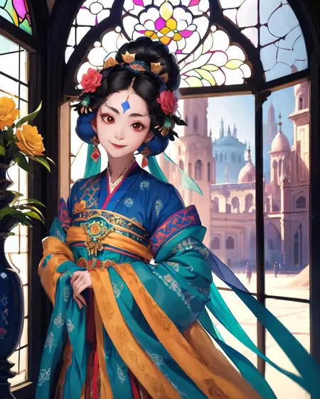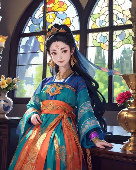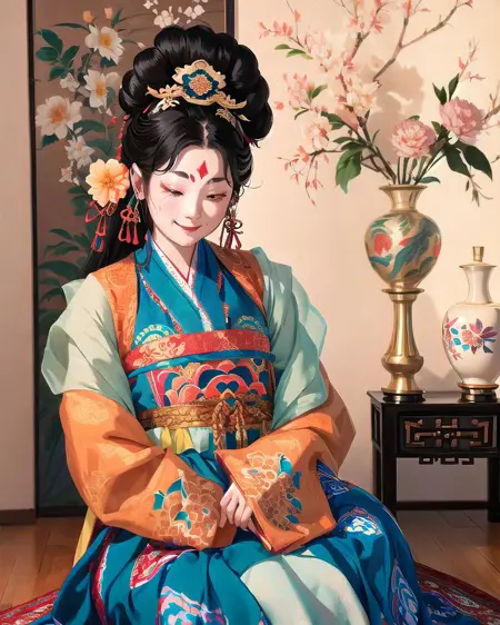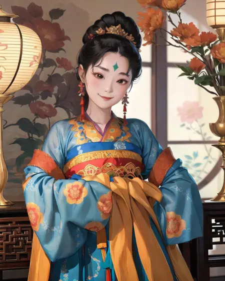一个用于生成唐代女性汉服的LoRA,也能绘制部分妆容,如花钿额饰。