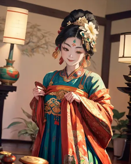 唐代服饰通常色调较为素雅,因此如果你发现得不到想要的效果,可能需要明确提示使用鲜艳色彩。不过我确实成功生成过鲜艳的款式,所以这是完全可能的。