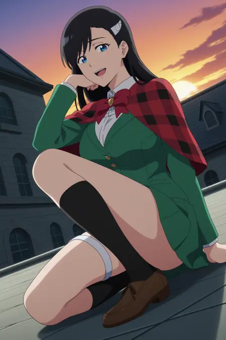 niihashi noel, 黒髪, 長髪, 青い目, 髪飾り, 長袖, 緑色のジャケット, 白シャツ, ポロシャツ, 赤いリボンネクタイ, 赤いカーディガン, チェック柄のカーディガン, 緑色のスカート, プリーツスカート, 大腿ストラップ, 黒色のニーソックス, 茶色の靴