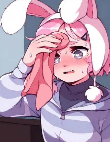 프롬프트: Sophie, short pink hair, large, fluffy bunny ears, striped hoodie, gray eyes, white pupil.