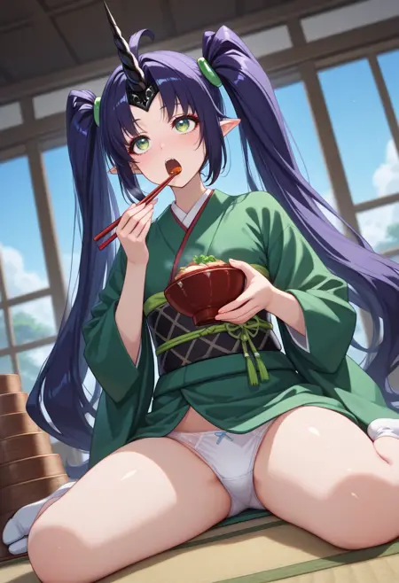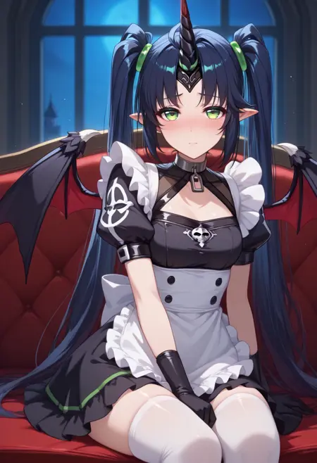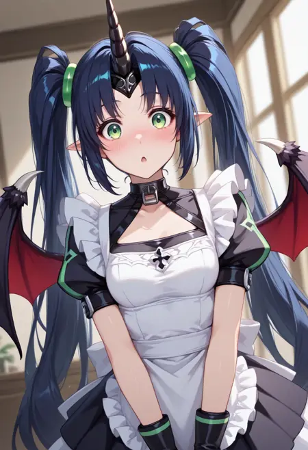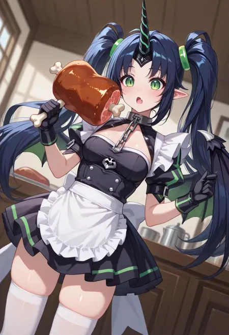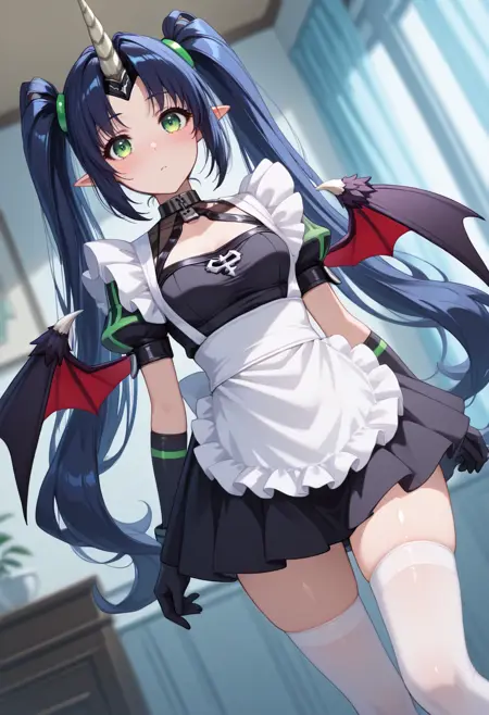 | 训练词汇 | beelzebub \(the seven deadly sins\), demon girl, pointy ears, long hair, twintails, green eyes, dark blue hair, white single horn, parted bangs, demon wings已复制! black dress, black gloves, frilled apron, frills, puffy short sleeves, short dress, white apron, white thighhighs, black boots, high heels已复制! |