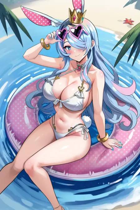 バンド衣装:ウサギの耳、 crown、ウサギの尾、ハート型のメガネ、頭にメガネ、ジュエリー、水着、白いビキニ、ハタラネック、ブレスレット