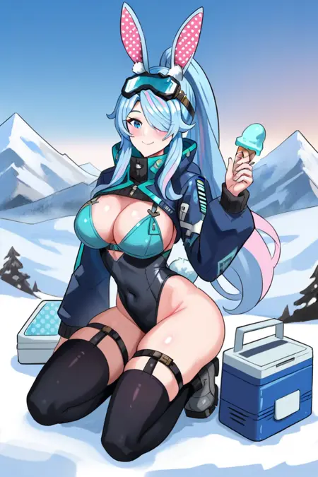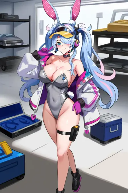 デフォルト衣装:ウサギの耳、 crown、ウサギの尾、ヘアバンド、白いレオタード、取り外し可能なカラー、ピンクのネクタイ、胸の間のネクタイ、シアンのジャケット、開いたジャケット、パンスト