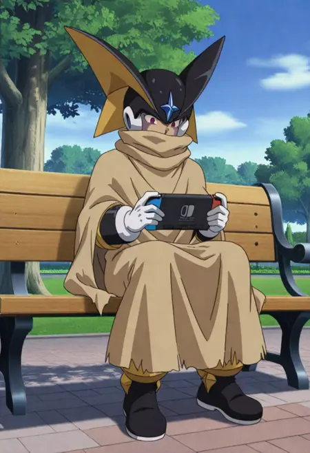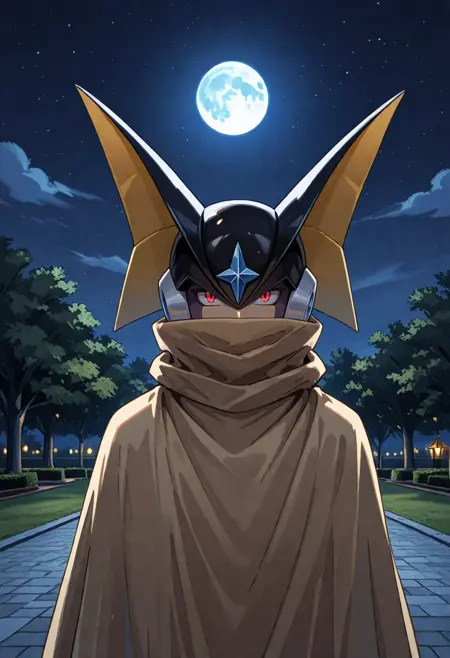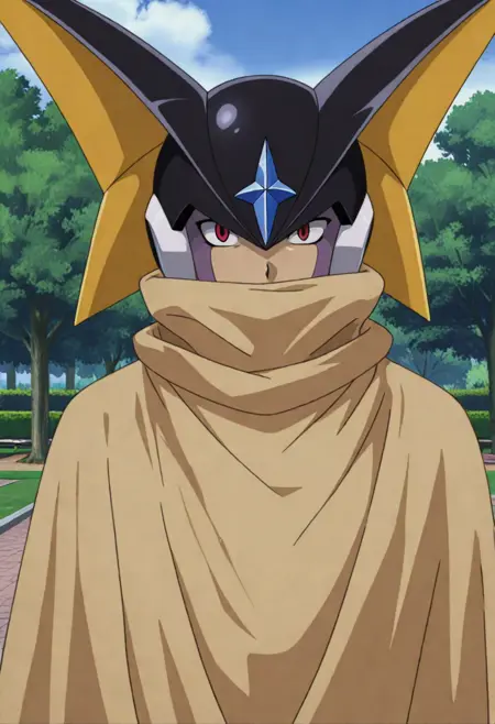 フルクロック版:ForteIL, 1boy, solo, helmet, red eyes, forehead jewel, cloak, covered mouth, black footwear