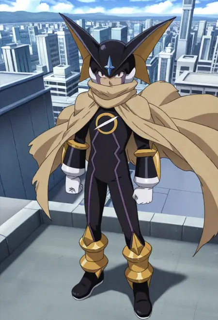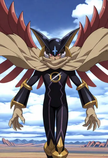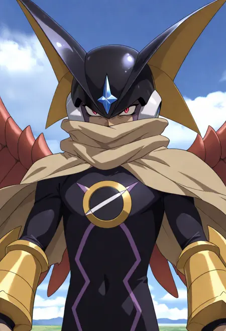 ビーストアウト・バース:ForteIL, ForteBeastIL, 1boy, solo, helmet, red eyes, forehead jewel, scarf, claws, brown gloves, bodysuit, armor, emblem, boots