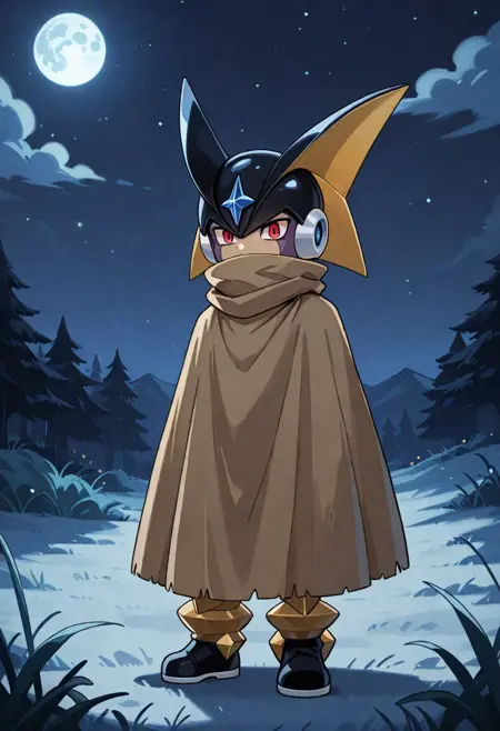 キャップ&ボディスーツ版:ForteIL, 1boy, solo, helmet, red eyes, white gloves, forehead jewel, cape, bodysuit, armor, emblem, boots