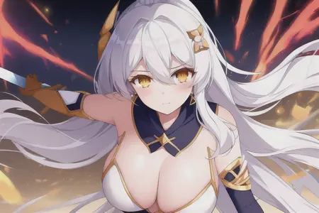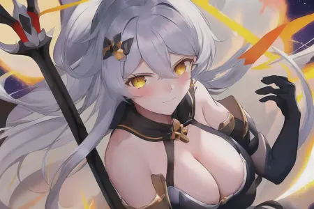 Kiana, 1girl, long hair, gloves, solo, yellow eyes, breasts, hair ornament, elbow gloves, looking at viewer, polearm, single elbow glove, spear, floating object, hair between eyes, energy wings