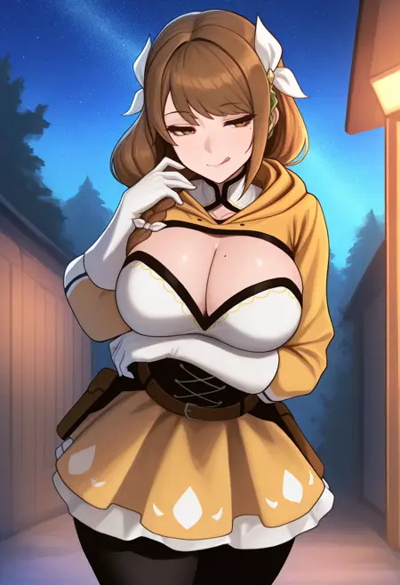 • 默认外观: defGm,长发,辫子,棕色头发,棕色眼睛,发带,发饰,连帽夹克,短外套(服装),胸部露空,大乳房,胸部痣,白色手套,黑色紧身胸衣,棕色腰带,腰带包,黄色裙子,紧身裤,吊袜带