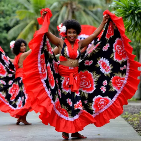 Authentic Attire: Showcases traditional Maloya dance costumes with vivid colors, intricate patterns, and flowing fabrics that enhance the movement.