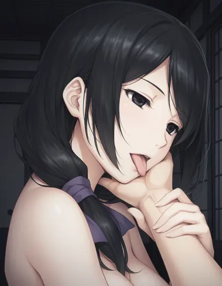 shigusa saya, black hair, low ponytail, hair over shoulder, black eyes, hair ribbon