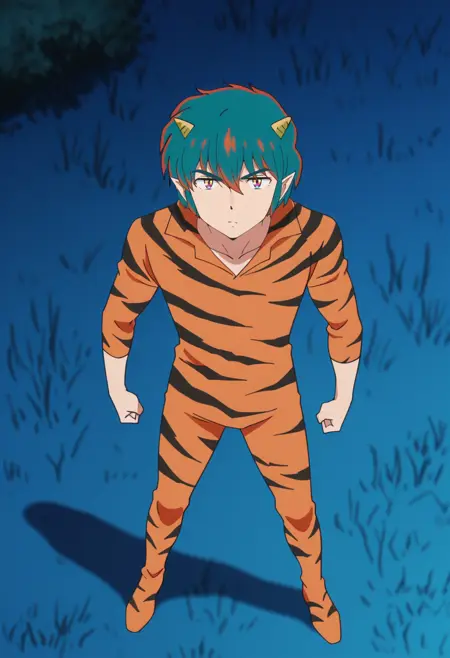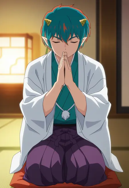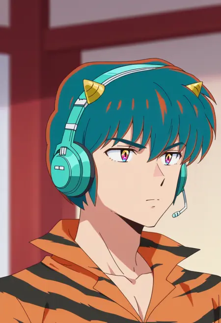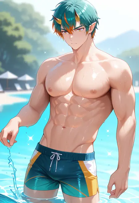 rei, teal hair, multicolored hair, multicolored eyes, short hair, oni horn, pointy ears