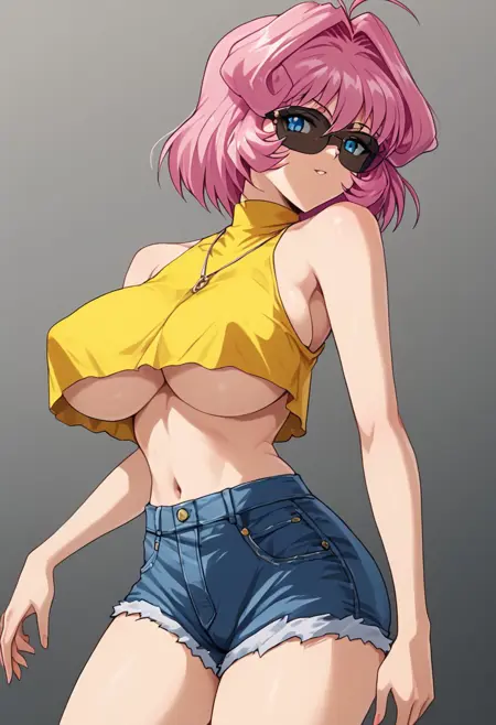 Rina_CD11, 1990s (style), 1girl, pink hair, medium hair, blue eyes, slim waist, wide hips, large breasts, perky breasts, perky ass,