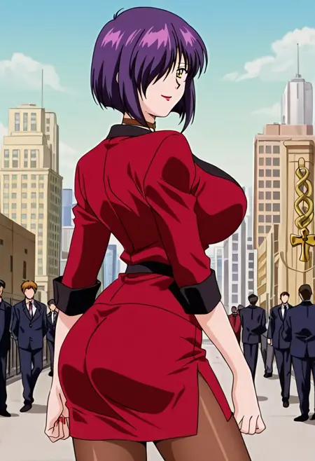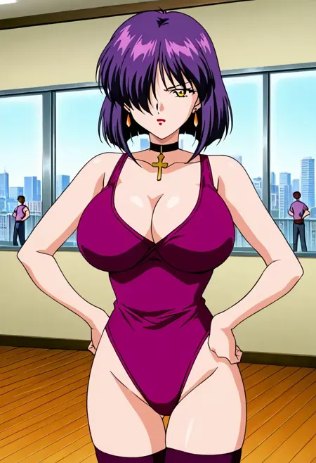 Ayaka_CD11, 1990s (style), 1girl, purple hair, medium hair, hair covering one eye, yellow eyes, red lipstick, (black choker, gold ankh), earrings, huge boobs, round breasts, round ass, hourglass figure,