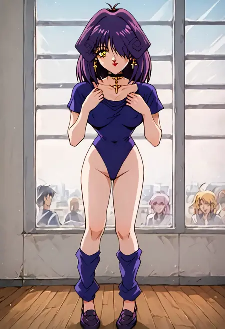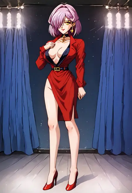 Ayaka_CD11, 1990년대(스타일), 1girl, 보라색 머리, 중간 길이 머리, 한쪽 눈을 가린 머리, 노란 눈, 빨간 립스틱, (검은 초커, 금색 앵크), 귀걸이, 거대한 가슴, 둥근 가슴, 둥근 엉덩이, 골반 시계 모양 체형,